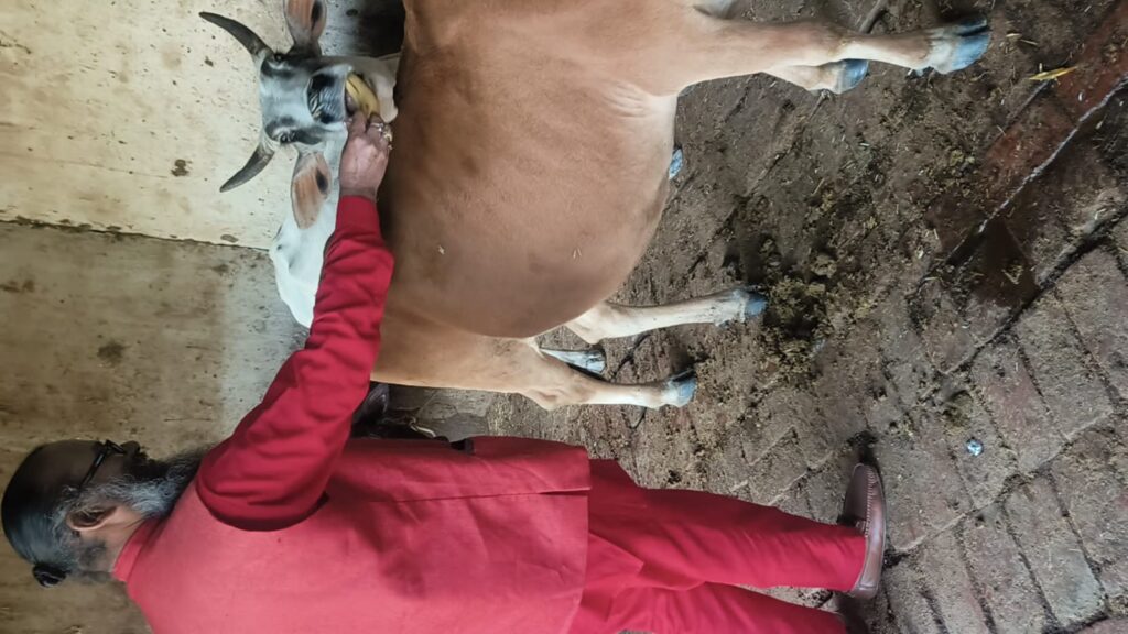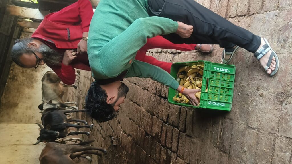 3. भक्तों द्वारा प्रेमपूर्वक गौ माता को केले खिलाना
